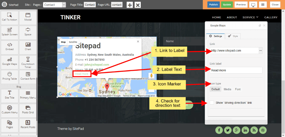 2) You can add Link Text to company details for other information and that text give Link also. If you want to change Icon then select Icon type, ‘Default is enabled when you drag and drop the widget.